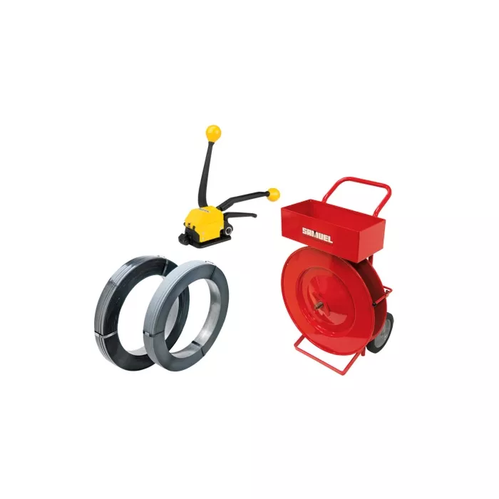 - Consists of the following components: ; 1- PC407 dispenser; 1-PF705 push bar tensioner fits 1/2"-3/4" width and fits strap thickness 0.015"-0.027"; 1-PA529 steel strapping 3/4", 1960' length and a capacity of 1800LBS