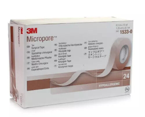 3M Micropore Surgical Tape is a tan paper tape designed for gentle application, particularly suitable for securing small to medium dressings on sensitive skin. Its highly breathable and porous nature helps maintain skin integrity, making it an ideal choice for elderly patients and moisture-prone areas. The tape is latex-free, hypoallergenic, and meets rigorous safety standards for medical use.