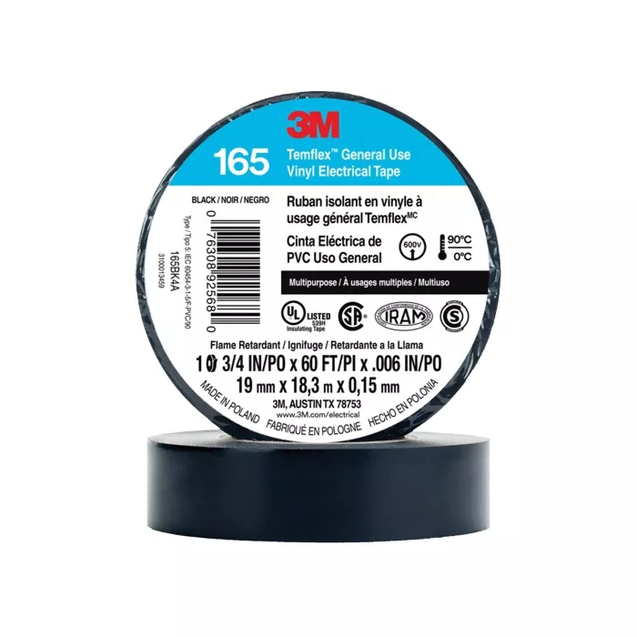 3M Temflex™ General Use Vinyl Electrical Tape 165, 19 mm (3/4") X 18 M (60'), 6 mils, Black (165BK4A)