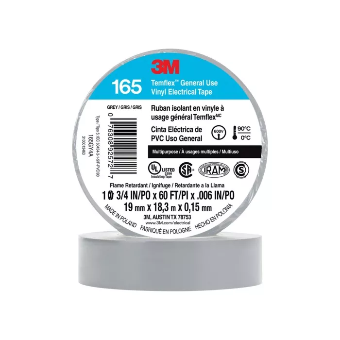 3M Temflex™ General Use Vinyl Electrical Tape 165, 19 mm (3/4") X 18 M (60'), 6 mils, Grey (165GY4A)