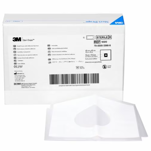 3M™ Steri-Drape™ Small Drape with Adhesive Aperture, 1020 is designed for use in ophthalmic surgical procedures. This impervious polyethylene film with a circular aperture creates a sterile surface and helps protect the surgical site.