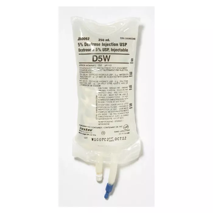 The 5% Dextrose IV Solution 250 mL is a sterile, non-pyrogenic solution of dextrose in water for injection. This intravenous (IV) solution is used to provide hydration and caloric intake to patients who are unable to take fluids or nutrients orally. It is also used as a diluent for other medications that require IV administration. The solution contains 5% dextrose (glucose) and is packaged in a 250ml bag, making it convenient for use in various healthcare settings.