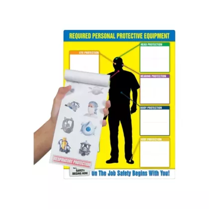 - Template chart measuring 24" x 18" with blank spaces provided, that is filled by placing PPE product pictorials from the included label booklet