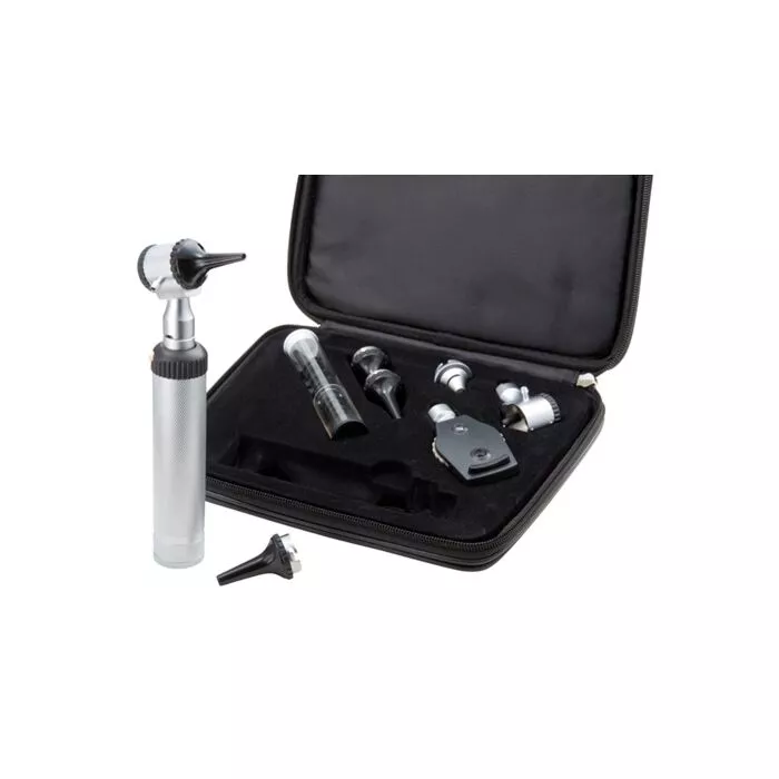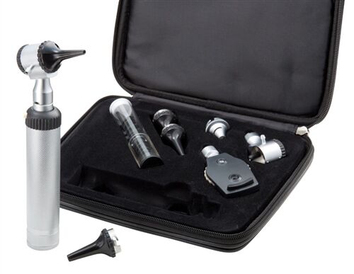 - Otoscope head with removable 4x magnifying lens, and insufflator fitting