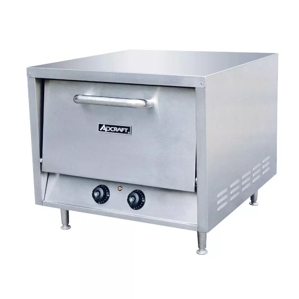 The Adcraft Countertop Single Deck Pizza Oven is designed to meet the demands of busy food service environments, offering a compact solution for efficiently baking pizzas, breads, and other bakery products. This stainless steel oven features two removable ceramic hearth baking shelves, a wide thermostat range, and a 15-minute continuous timer, ensuring versatility and performance. Ideal for establishments with limited space, it operates at 240V and provides reliable temperature control.