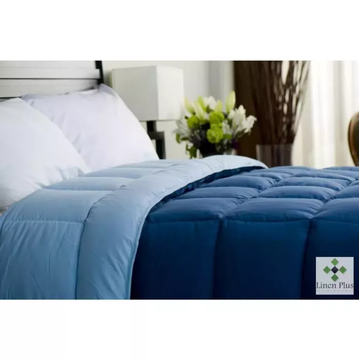 Upgrade your bedding with the Adonis Hypoallergenic Microfiber Comforters, designed for maximum comfort and durability. Measuring 72" x 90", these comforters are ideal for commercial use, including camp services, university dorms, and long-term care facilities. The two-toned reversible design in wedge blue and royal blue adds versatility and style to any room.