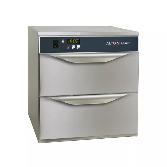 The Alto-Shaam 16.7" Narrow 2 Drawer Warmer is designed for heavy-duty use in compact kitchens, featuring a slim design ideal for space optimization. Utilizing Halo Heat technology, it keeps food hot and fresh without water or harsh heating elements. This product is made in the USA and ensures consistent temperatures with a waterless design that reduces installation and operating costs.