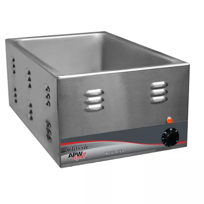 The APW Wyott W-3Vi countertop warmer is perfect for holding pre-cooked foods at NSF safe temperatures. These units can be used with a variety of pan sizes or adapter plates for round insets. Serpentine-shaped heating elements ensure heat is distributed evenly. 1-inch insulation keeps heat in the product and protects countertops. Thermostatic controls and knob guards are standard.