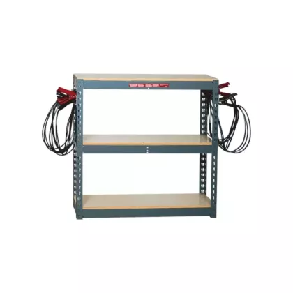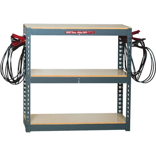 - Stores up to 15 batteries on heavy-gauge steel rack with acid-resistant shelves