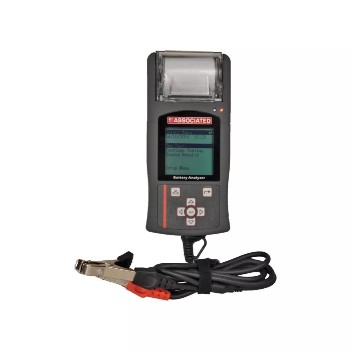 - Lightweight hand‐held digital battery tester with thermal printer and USB port