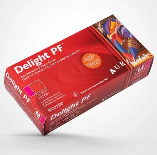 Introducing Aurelia Delight Vinyl Powder Free Gloves in size Medium, available in a box of 100 gloves. These gloves are designed to provide reliable protection and comfortable wear, making them an excellent choice for various medical and non-medical applications.