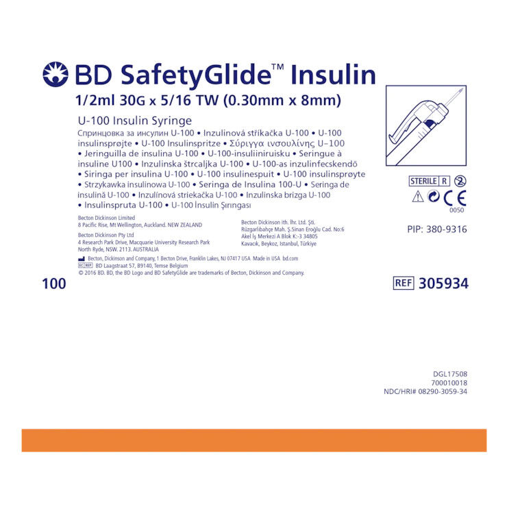 BD SafetyGlide Insulin Syringe/Needle Combo 0.5cc 30g x 5/16" 100/box