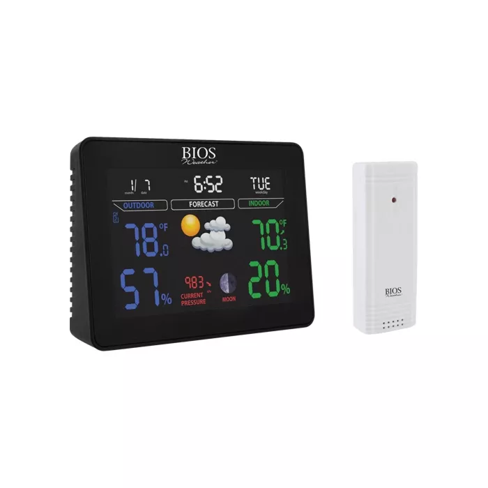 - Features barometric pressure, weather forecast, moon phase, and calendar clock with snooze alarm