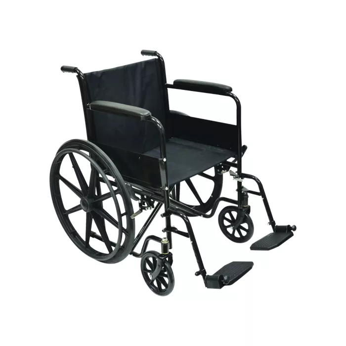 - Steel framed folding wheelchair with removable foot rests, full length fixed arms, solid tires, and embossed lightweight vinyl upholstery