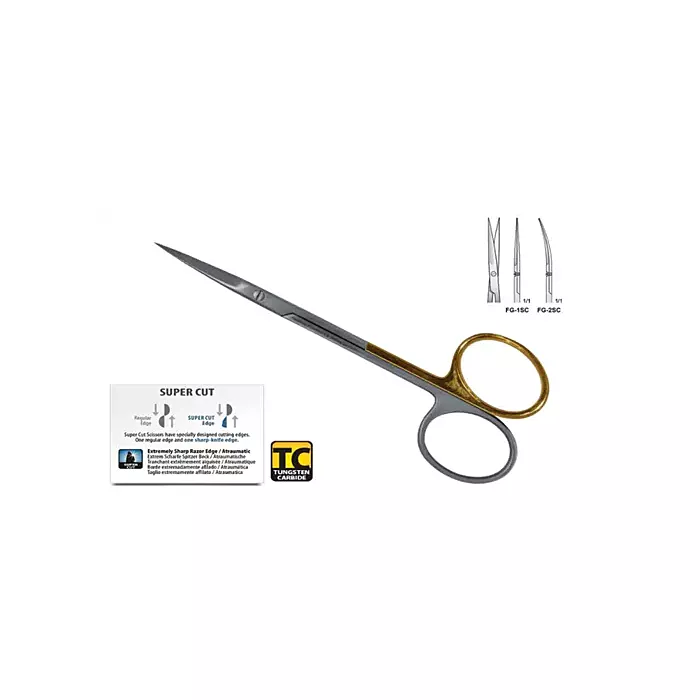 Iris Super Cut Scissors CurvedLength: 110mmMaterial: Tungsten Carbide InsertsSuper Cut Scissors have specially designed cutting edges.Unique design features allow extremely smooth cutting of fine and coarse tissue with reduced trauma.Cutting blade honed to "razor" sharpness with opposing blade finished with fine serrations to avoid tissue slippage.