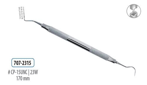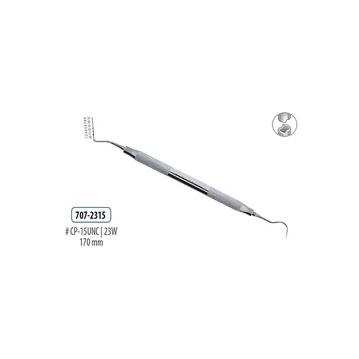 Periodontal Explorer/Probe # 23/CP-15Hollow ConstructionLength: 170mmCalibration Markers: 1-2-3-4-6-7-8-9-10-11-12-13-14-15Material: Martensitic Stainless Steel