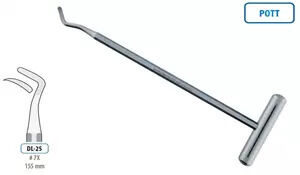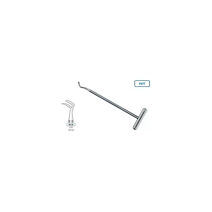 Root Elevator Pott LeftLength: 150mmMaterial: Martensitic Stainless SteelUsed to loosen the tooth from the periodontal ligament and ease extraction.