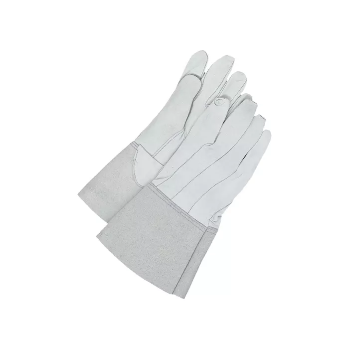 - Cowhide split gauntlet cuff with sheepskin grain lap for added protection