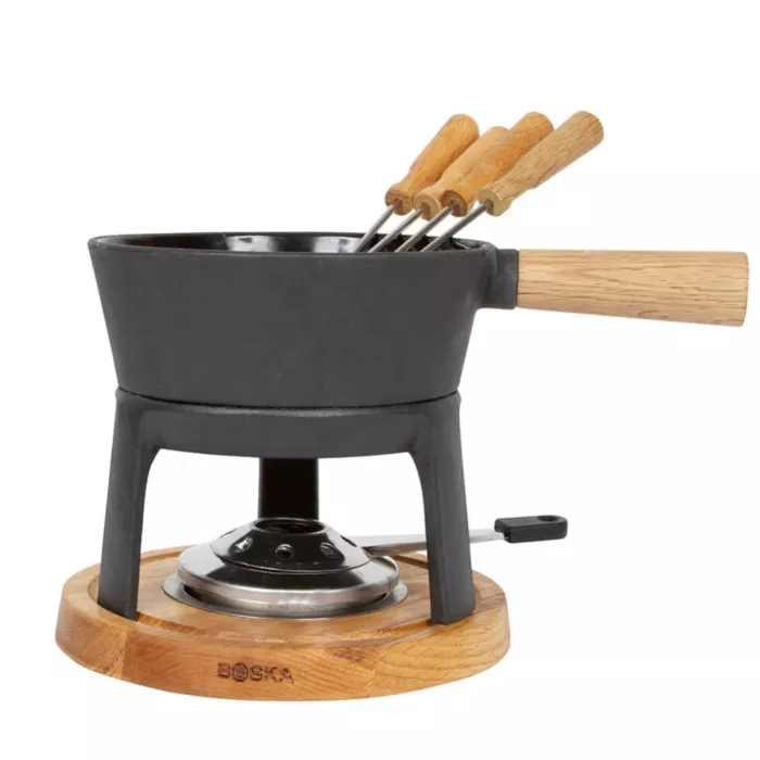 The wooden handle, wooden base, and cast iron pot give the Fondue Set Pro a cool and stylish appearance. The pot is suitable for one liter of cheese. The set comes complete with a base, a burner, six fondue forks, and a cool gift box. It’s a great gift idea!