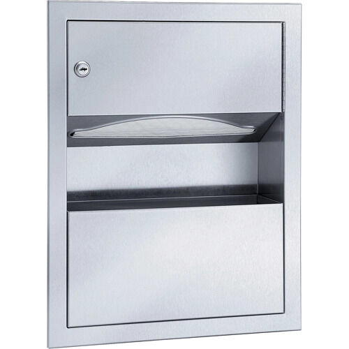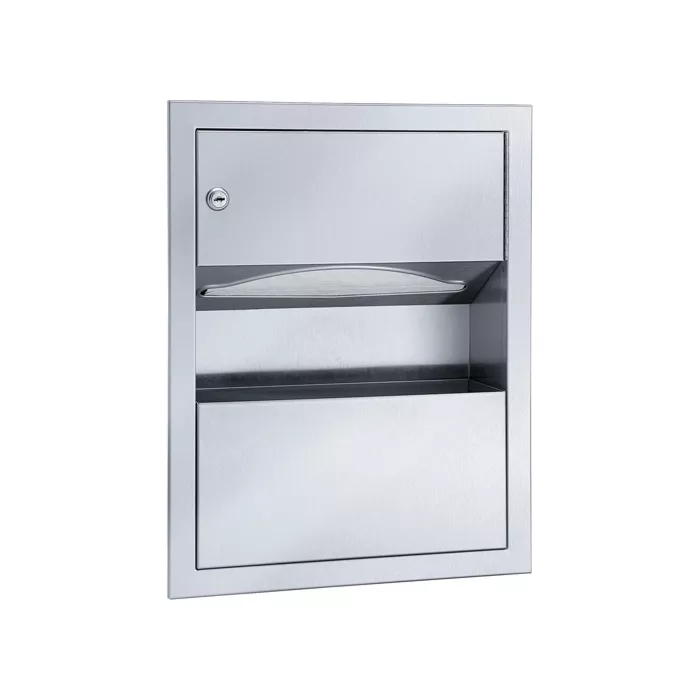 - Towel dispenser, flange, cabinet, door and waste receptacle insert fabricated of 304 (18-8) stainless steel with exposed surfaces in architectural satin finish