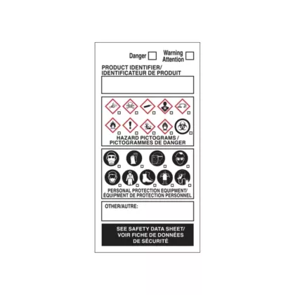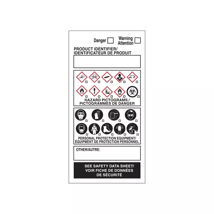 - Simply enter the product identifier using a pen or a permanent marker, pick the appropriate WHMIS and PPE symbols, add any specific handling precautions, apply laminate and adhere label to the container