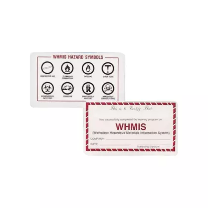 - Indicated date of WHMIS certification verifying employee's WHMIS training. Reverse side features a handy reminder of WHMIS symbols. Package: 25 cards.