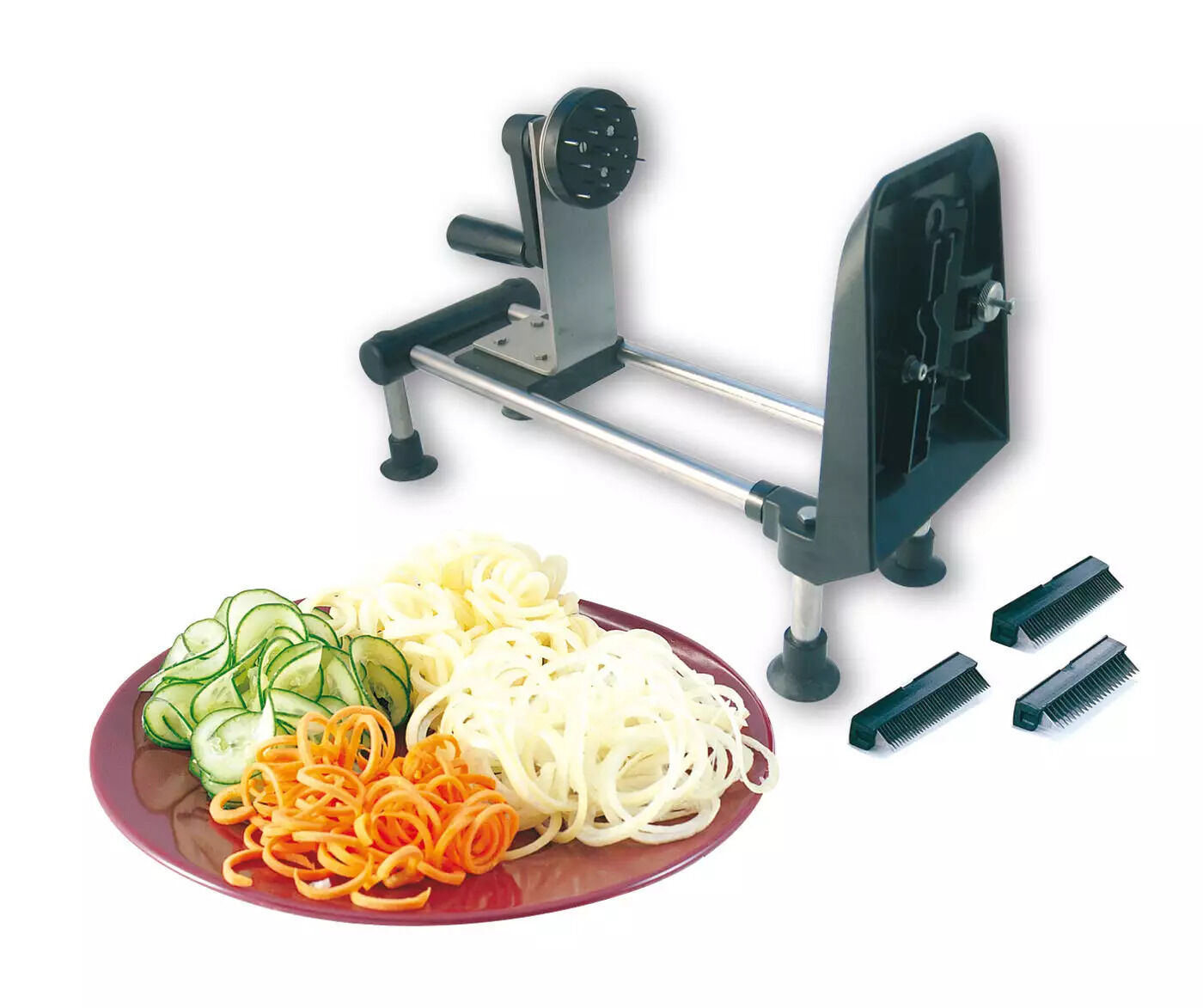 - Angel hair: 1 & 2 blades. Spaghetti: 4 mm blade. Adjustment thickness: 1 to 3.5 mm. Frame in stainless steel on four suction cups, blade holder face plate in composite material, vegetable spinning wheel in plastic, stainless steel blades