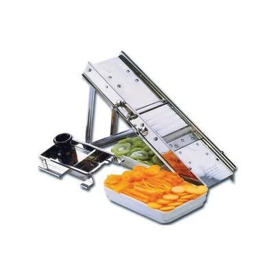The "Original" and the " Professional" Bron Coucke mandoline combines lots of different cutting blades into one easy-to-use device. Fruits and vegetables, no matter how hard or delicate, are sliced with precision into slices, sticks, and waffled slices with ease. A guard protects your fingers from getting too close to the steel blade while you work. The patented table edge support gives you more stability, security and efficiency. Included: 1 x 19638 (Julienne Blade), 1 x 3802 (Flat Blade) and 1 x 39 (Stainless Steel hand guard)