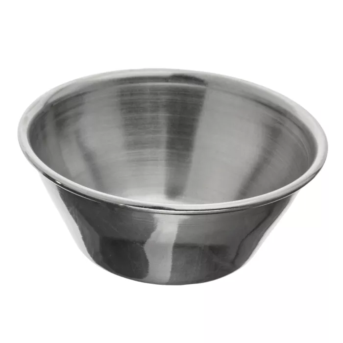 4 oz ramekin / sauce cup with a rolled edge. Stainless steel construction. Satin finish interior. Mirror finish exterior.