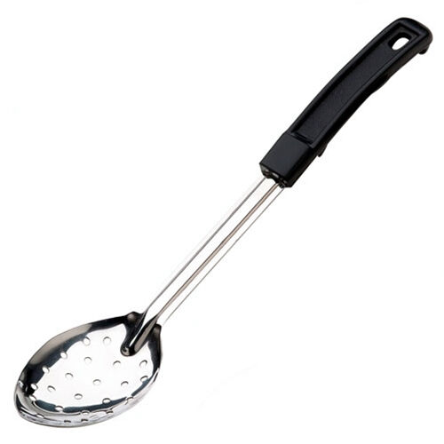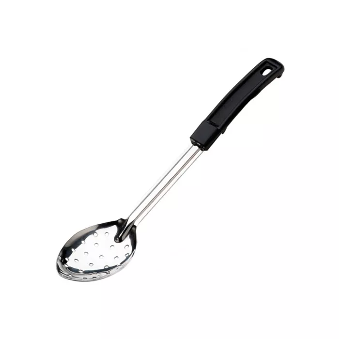 Stainless steel. Black polypropylene handles, with a hanging hole. Grooved handle for added durability. 1.5mm thickness.