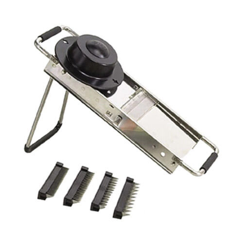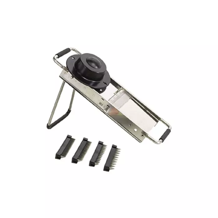 • (4) julienne blades (2, 4, 7 & 10 mm), (1) serrated blade with thickness adjustment, (1) adjustable, removable straight cut blade & revolving stand