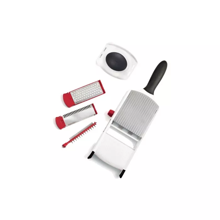 • Includes hand guard and (3) interchangeable stainless steel blades: slicing