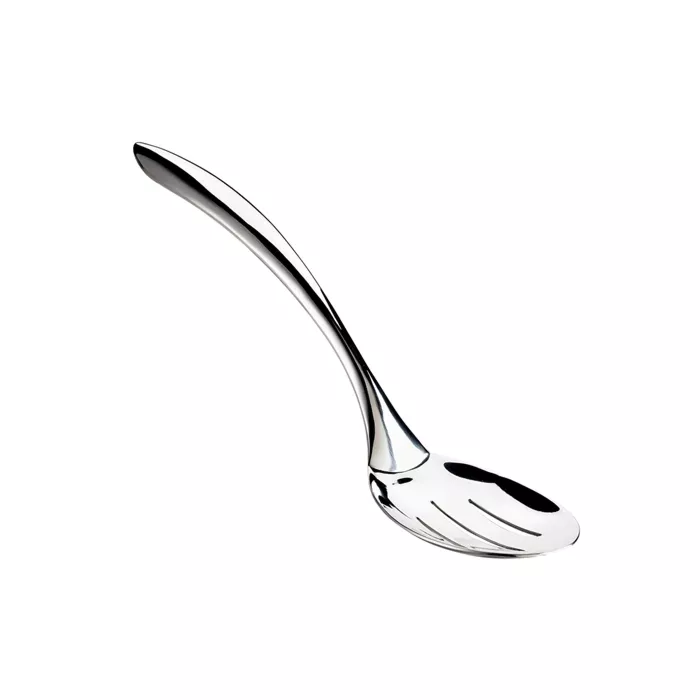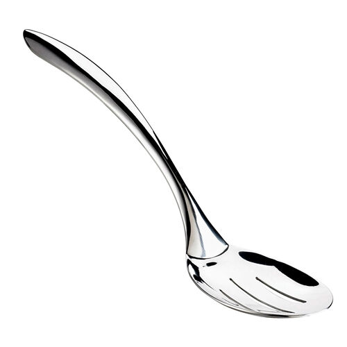 Eclipse stainless serving utensils feature "Stay Cool" tapered, hollow handles designed to provide a comfortable grip. Their unique arc handle "easy pick up" design reduces slippage in servingware and provides ease of handling. The angled servicing area keeps food off the table if utensil is put down. Mirror finish.