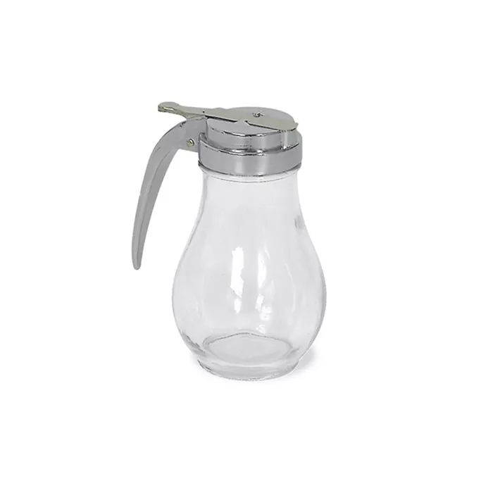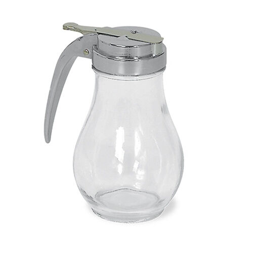 14oz Syrup Pourer. 6x3½in. Glass with Chrome Plated Top. This dispenser has a tear-drop shaped glass jar and a one-piece chrome plated flat metal top with stainless steel slide and a rubber gasket.