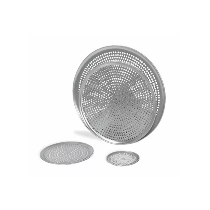 1.0 mm gauge .040 thickness. Perforation allows pizza bottom to cook faster and crust crispier.