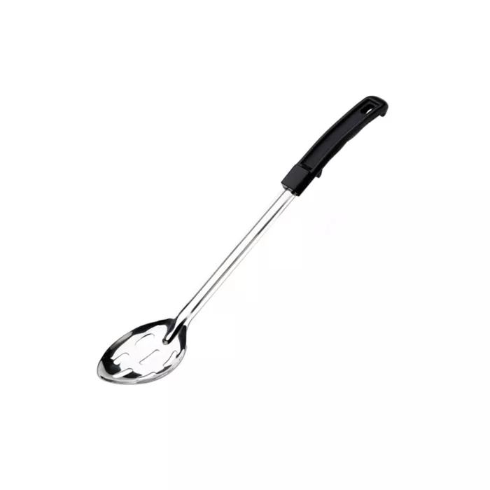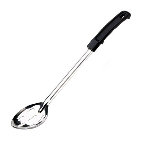 Stainless steel. Black polypropylene handles, with a hanging hole. Grooved handle for added durability. 1.5mm thickness.