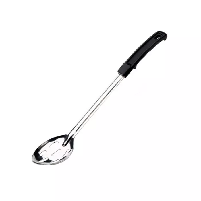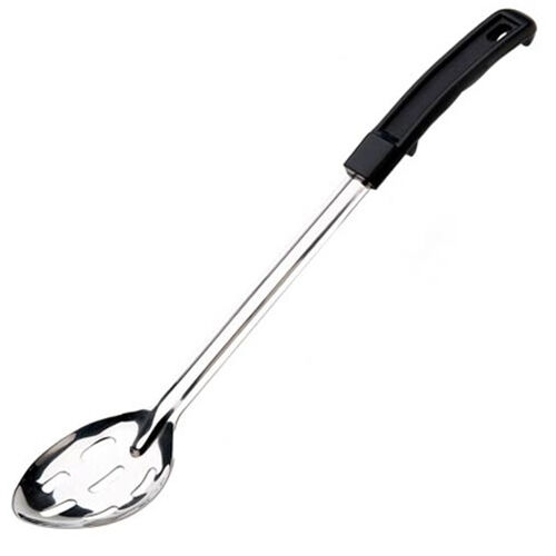 Stainless steel. Black polypropylene handles, with a hanging hole. Grooved handle for added durability. 1.5mm thickness.