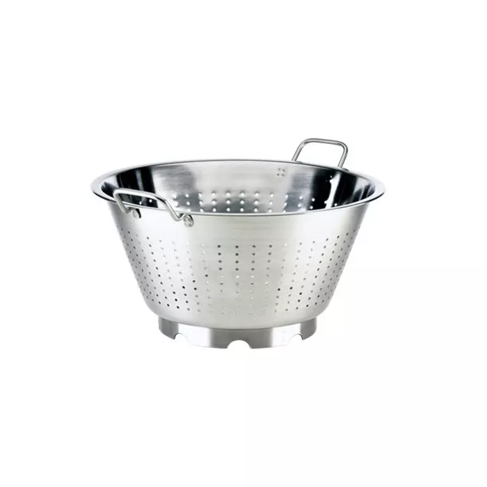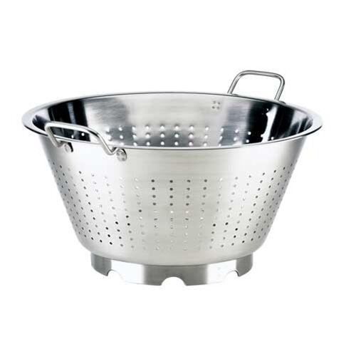 Stainless steel. Mirror finish. Wide, deep bottom and tall sides allow water to drain quickly. Wide steady round stable base. Large, looped handles for secure grip.