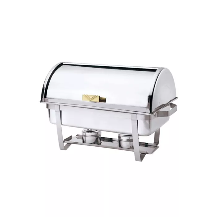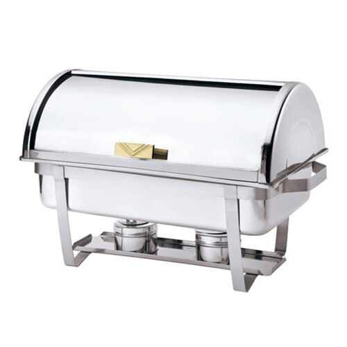 Economical but not without flair, this mirror-finished roll top chafer with gold-toned handle will keep the food hot and make for a handsome buffet piece.