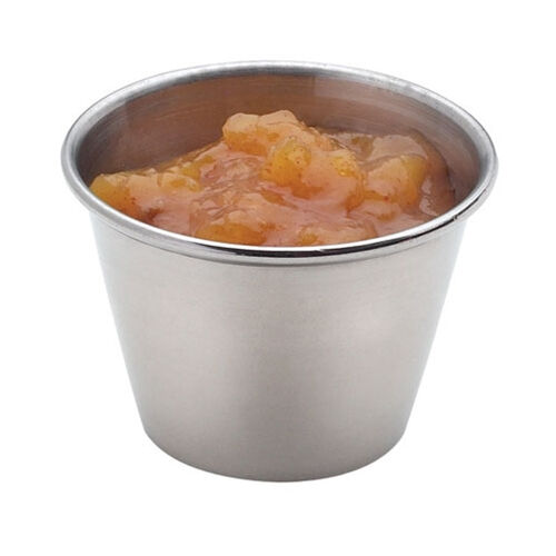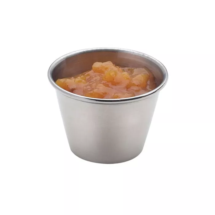 Stainless steel sauce cup. Mirror finish exterior. Satin finish interior. Plain rolled edge. 1.5 oz.
