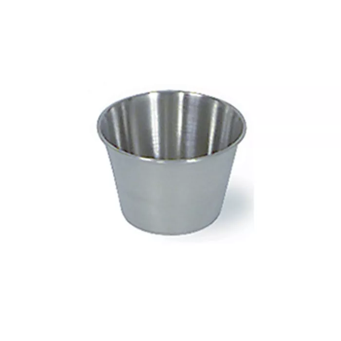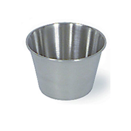 Stainless steel sauce cup. Mirror finish exterior. Satin finish interior. Plain rolled edge. 2.5oz