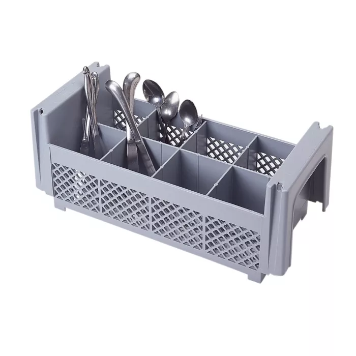 Maintain and service silverware with ease in the convenient array of Camrack Flatware Racks, designed to suit any food service operation. The classic full and half size Flatware Rack offers open inside grating that provides thorough circulation of water and promotes quick drying. Closed outer walls keep fingers and contaminates out, and racks stack with other full and half size Camracks for easy, sanitary storage. The 8-Compartment Flatware Basket comes with and without handles, fitting neatly inside a full or half size Base Camrack for washing, transport, and storage. The Flatware Cylinder is ideal for display and service, neatly fitting the Cambro Tray and Dish Cart. Camrack Flatware Racks are an outstanding, economical choice that does not compromise the durability and reliability Cambro has to offer.