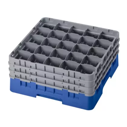 The Camrack® (25S638168) is a full-size, low-profile glass rack featuring 25 open compartments and three soft-gray extenders mounted on a vibrant blue base. It’s engineered for seamless washing, storage, and transport in high-volume commercial kitchens—designed to improve efficiency while safeguarding your glassware.