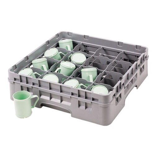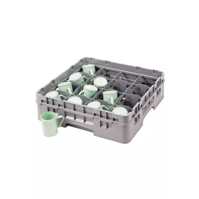 Wash, store and safely transport mugs and cups. Open inside compartments ensure thorough cleaning. Closed external walls keep fingers and contaminants out. Tilt feature drains water from mug bases for quick and sanitary drying. Smooth sides and rounded corners reduce risk of injury. Smooth top rim ensures quick, stable stacking. Inter-stacks with all other racks. Durable, long-lasting polypropylene will withstand chemicals and high temperatures up to 200°F (93,3°C). Fits through any commercial dishwasher.