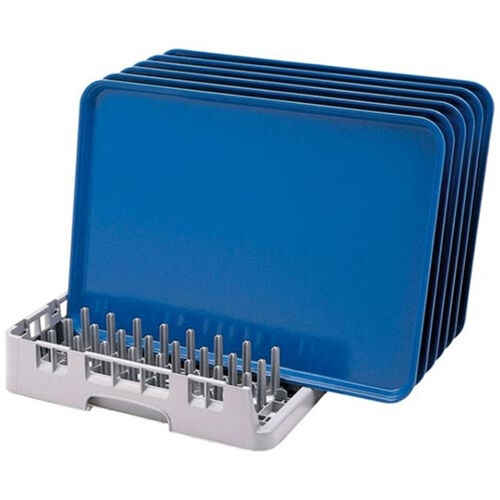 For plates, bowls, trays and plate covers. Open end tray rack holds cafeteria trays or full-size sheet pans. Durable polypropylene will withstand chemicals and high temperatures up to 200°F (93,3°C). Smooth top rim ensures quick, stable stacking. Inter-stacks with all other racks. Fits through any commercial dishwasher.