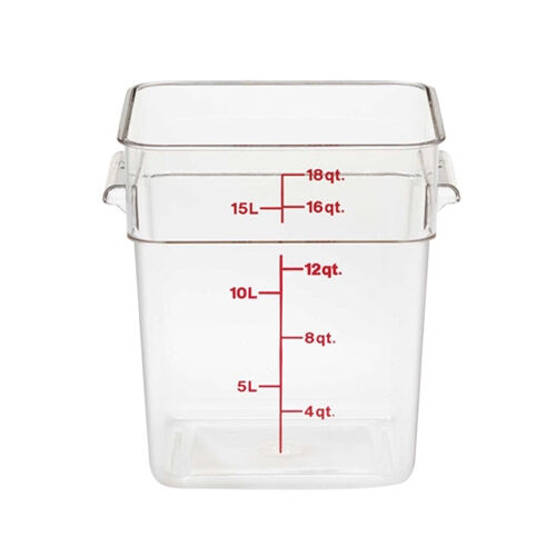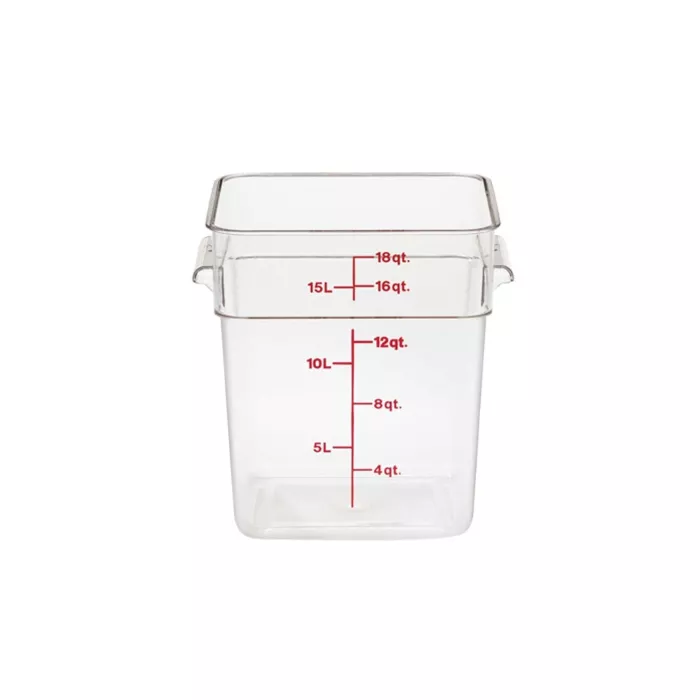 Use to maximize storage of ingredients in kitchens, coolers, freezers or pantries. Inventory at a glance, with easy to read color graduations on the outside. Color-coded snap-tight polyethylene covers match graduation colors and feature thumb tabs for easy removal. Made of crystal clear, virtually unbreakable Camwear® polycarbonate. Withstands temperatures from -40°F to 210°F (-40°C to 99°C).