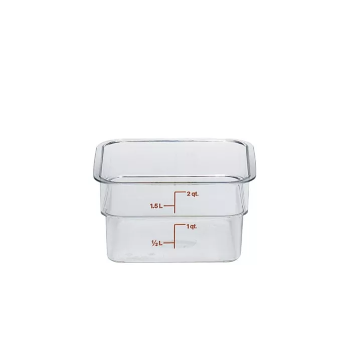 Use to maximize storage of ingredients in kitchen, coolers, freezers or pantries. Inventory at a glance, with easy to read color graduations on the outside. Color-coded snap-tight polyethylene covers match graduation colors and feature thumb tabs for easy removal. Made of crystal clear, virtually unbreakable Camwear® polycarbonate. Withstands temperatures from -40ºF to 210ºF (-40ºC-99ºC).