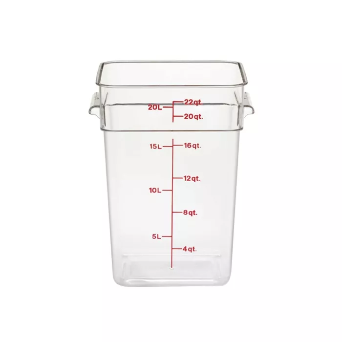 Use to maximize storage of ingredients in kitchen, coolers, freezers or pantries. Inventory at a glance with easy to read color graduations. Color-coded snap-tight polyethylene covers match graduation colors and feature thumb tabs for easy removal. Made of crystal clear, virtually unbreakable Camwear® polycarbonate. Withstands temperatures from -40ºF to 210ºF (-40ºC to 99ºC).