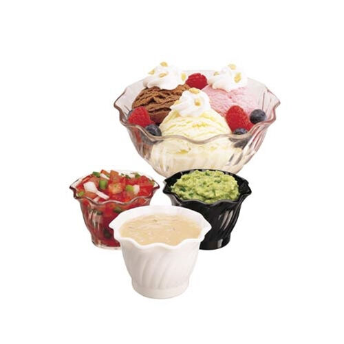 This swirled bowl beautifully presents your ice cream sundaes, sherbet, yogurt, pudding, cobblers, and even fresh fruit. Use them also for side dishes, small salads, dips or soups. They conveniently fit on a plate or can be stacked in place on a buffet station. Made of virtually unbreakable Camwear® polycarbonate. Commercial dishwasher safe. Colours: clear (135), black (110), white (148). NSF listed.