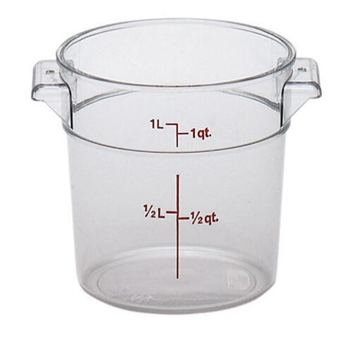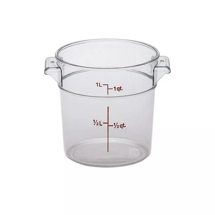An affordable choice. Use to store ingredients or transport ready to serve or partially prepared foods. Round shape promotes proper air circulation around container. Easy to read imprinted graduations on the outside for inventory at a glance. Molded-in holes in the handles for quick and sanitary drying. Snap on covers fit tightly, yet can be easily removed. (Note: lids are not interchangeable) Made of impact, stain and chemical resistant solid white plastic. Withstands temperatures from -40ºF to 160ºF. NSF listed.